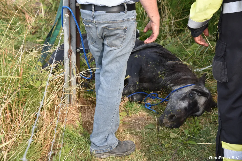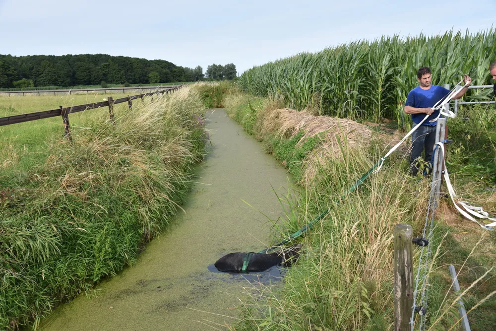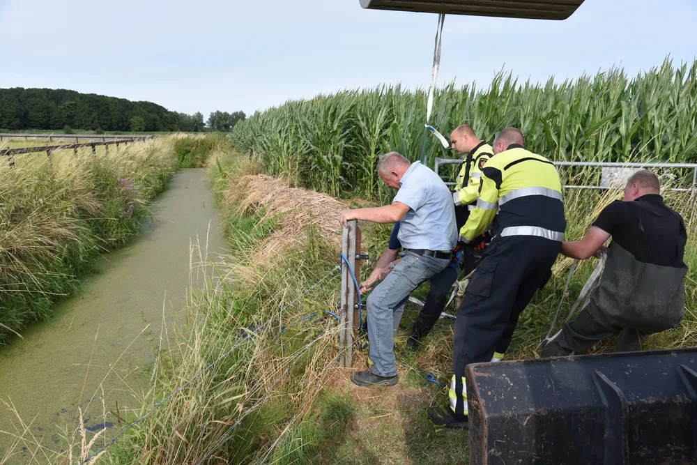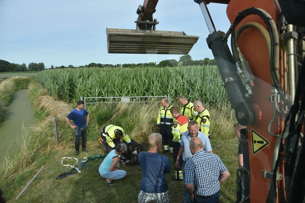 Door middel van de kraan kon het dier uit de sloot gehaald worden.