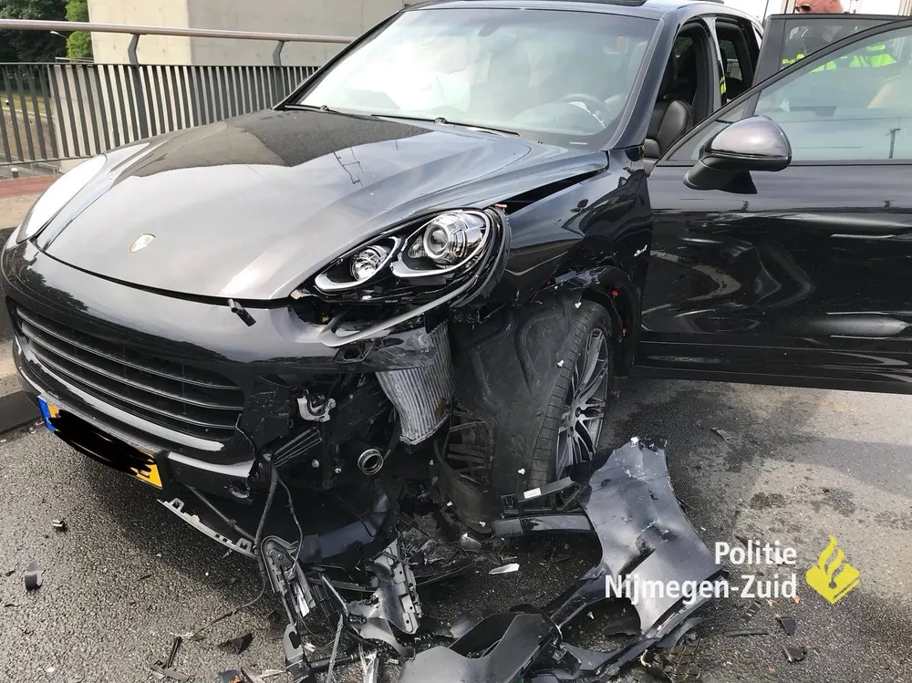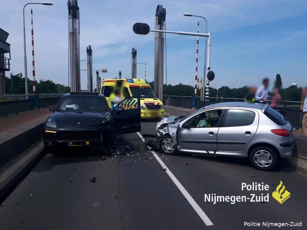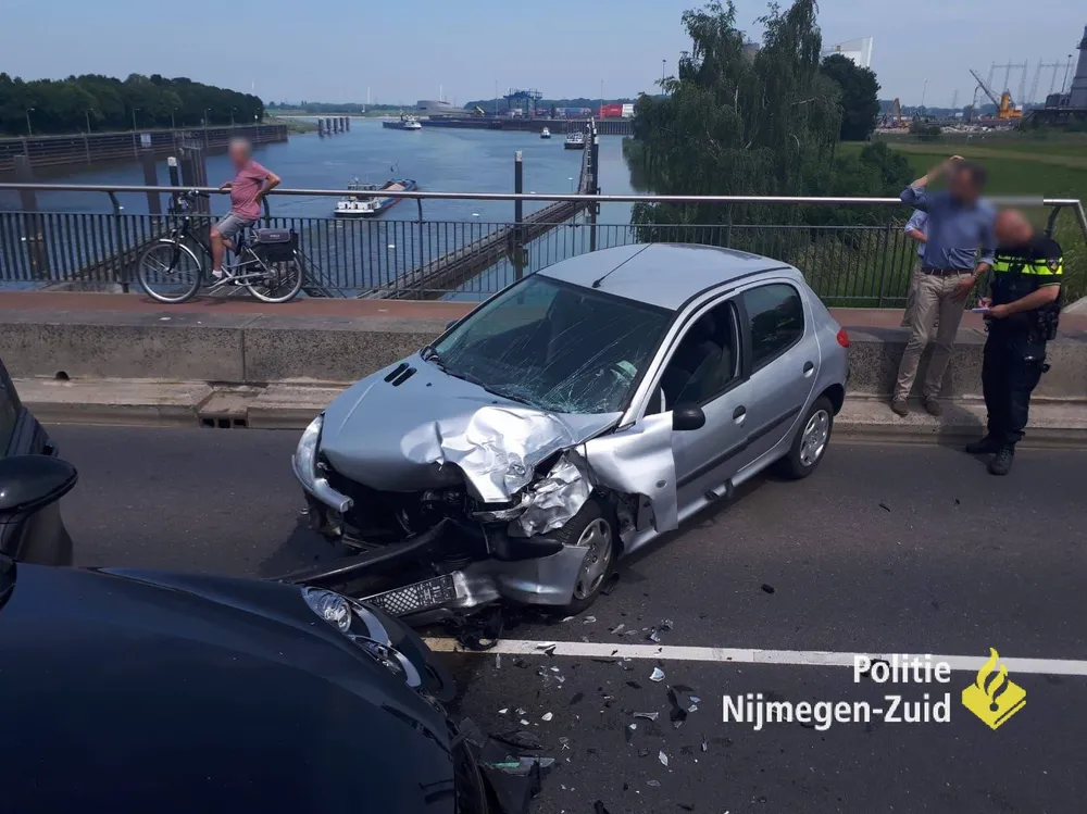 Maandagmiddag zijn op de sluis in Weurt twee auto's tegen elkaar gereden.