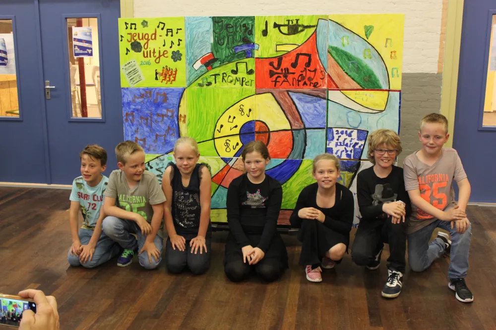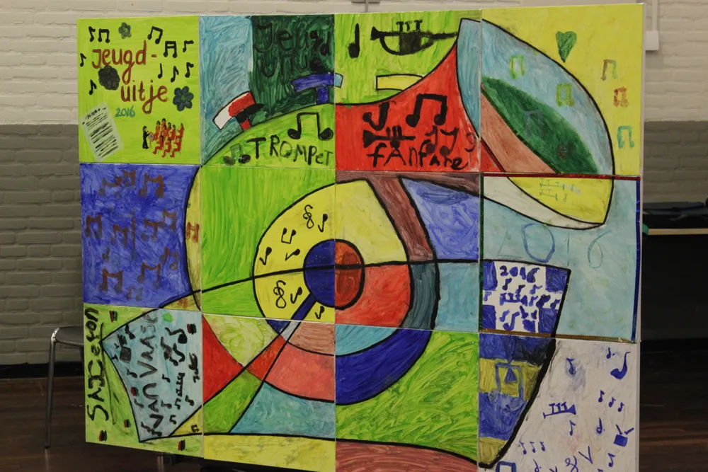 De grootste verassing werd bewaard tot het eind. Eerder dit jaar hebben de leerlingen een jeugduitje gehad waarbij ze een kunstwerk hebben gemaakt. Het kunstwerk dat werd onthult bestaat uit diverse delen waarbij elke leerling een deel voor haar rekening heeft genomen en het logo van de muziekvereniging in verwerkt zit.