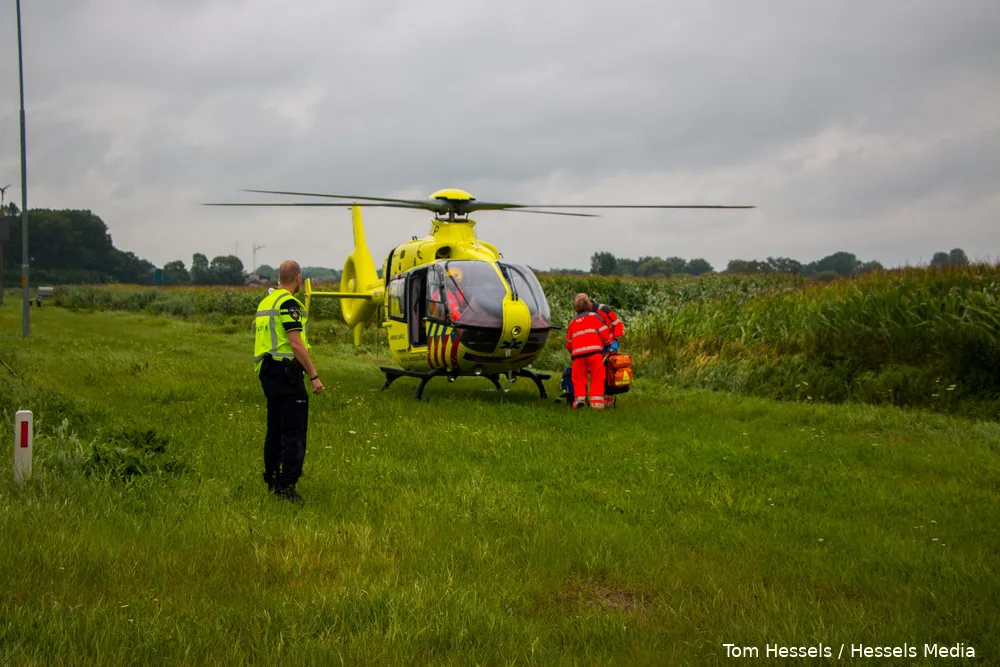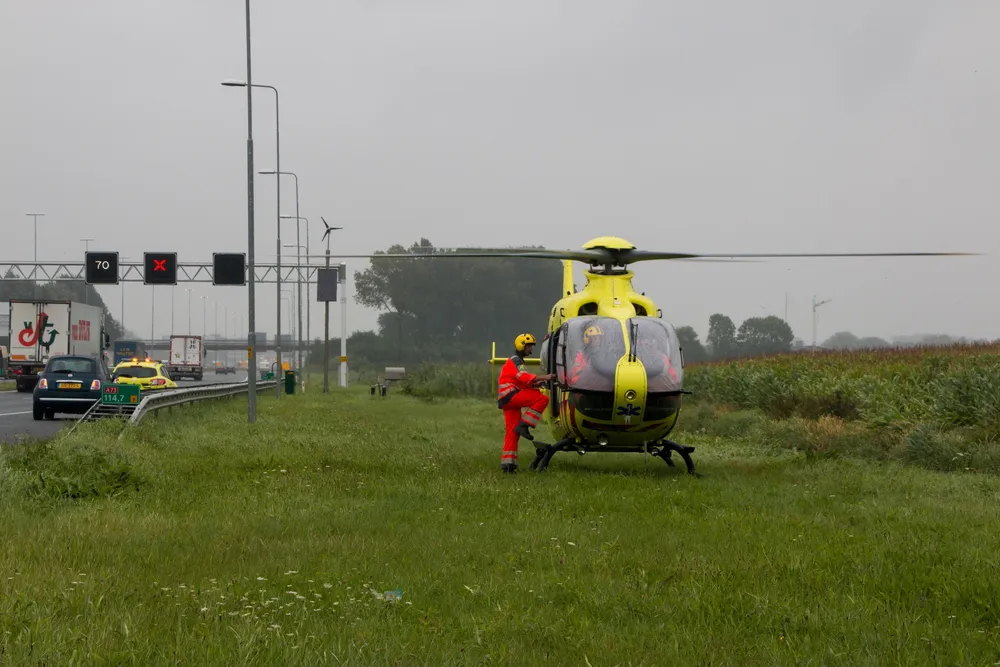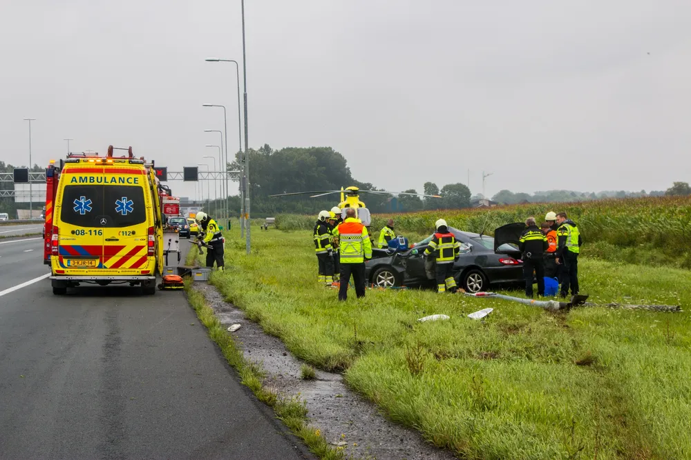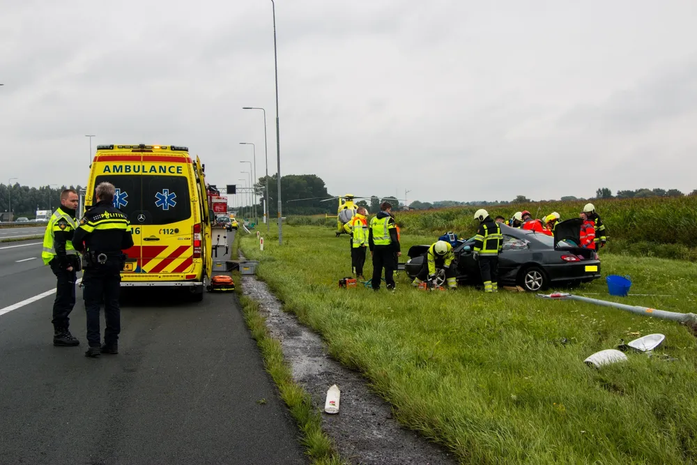 Ewijk, 11-08-2016 - Bij een eenzijdig ongeval op de A50 ter hoogte van Ewijk is donderdagmiddag een man zwaargewond geraakt. Politie, brandweer, ambulance en ook de traumahelikopter kwamen ter plaatse.